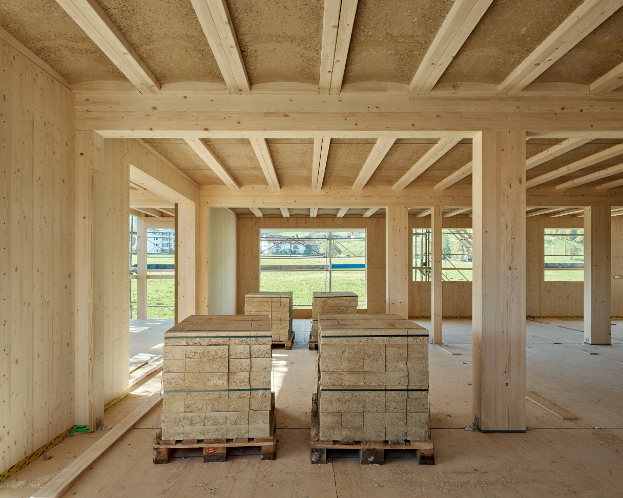Ziel des Projektes war ein pragmatisches Gleichgewicht zwischen Ökologie und Ökonomie, damit Energie, Ressourcen und Finanzmittel möglichst sparsam eingesetzt werden können. Die Gebäudeform entspricht den historischen Bauernhäusern in der Umgebung, das grosse Dach schützt das Gebäude und dient der Elektrizitäts- und Wärmeproduktion. Die Tragstruktur des Gebäudes ist ein einfacher Holzrahmenbau mit robotergestampften Holzlehmdecken der Firma rematter. Der nichttragende Stampflehm zwischen den Holzrippen dient dem Brandschutz, dem Schallschutz, sowie dem Temperatur- und Feuchtigkeitsausgleich. Die Holzfassade wird leicht karbonisert und geölt, damit das Material auf natürliche Weise geschützt ist. Fotos: Roland Bernath
