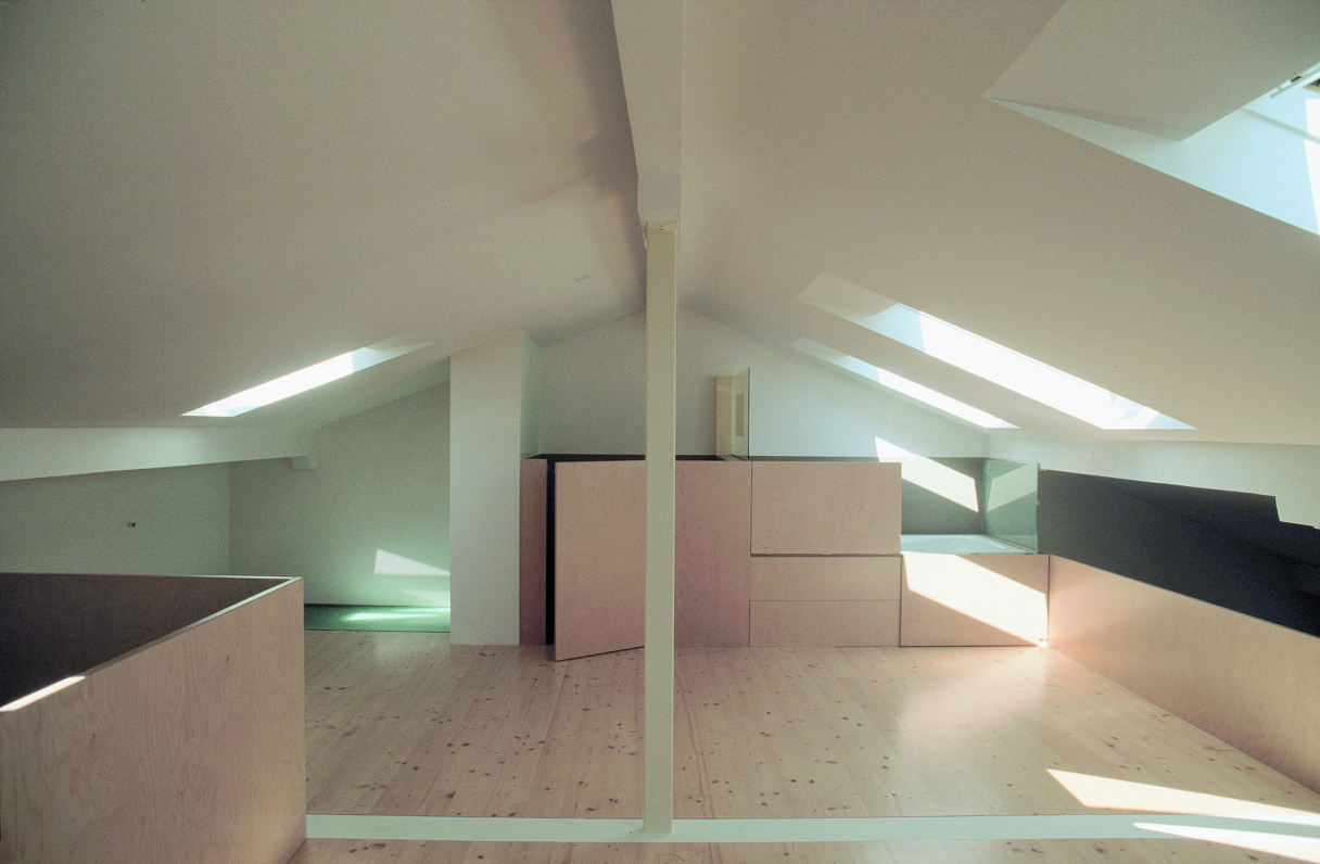 Die Dachwohnung in einem Gebäude aus den dreissiger Jahren wurde als Altersitz für ein Ehepaar umgebaut. Der Wunsch mit den bestehenden geometrischen Gegebenheiten des Daches zu arbeiten und diese zu verstärken führte zur Freilegung der bestehenden Struktur in einen einzigen zweigeschossigen Raum. Vier neue Dachfenster geben dem Raum eine angemessene Belichtung und einen Bezug zum Himmel. Die hellen Pastelltöne verstärken den Lichteinfall und machen aus dem Innenraum ein abstraktes Volumen.