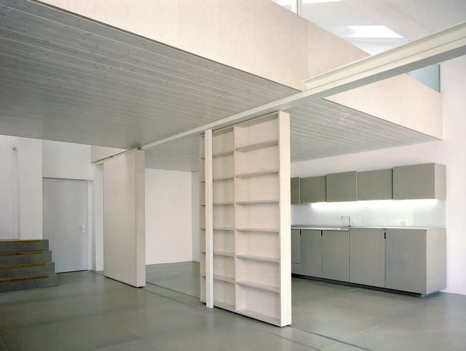 Im unteren Geschoss befindet sich der Eingang, die offene Küche und eine Dusche mit WC. Ein System von beweglichen Regalen ermöglicht eine flexible Unterteilung des Raumes.