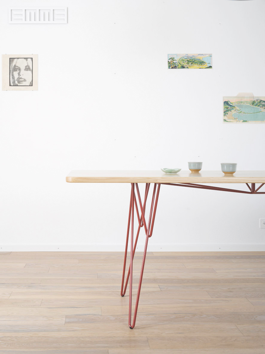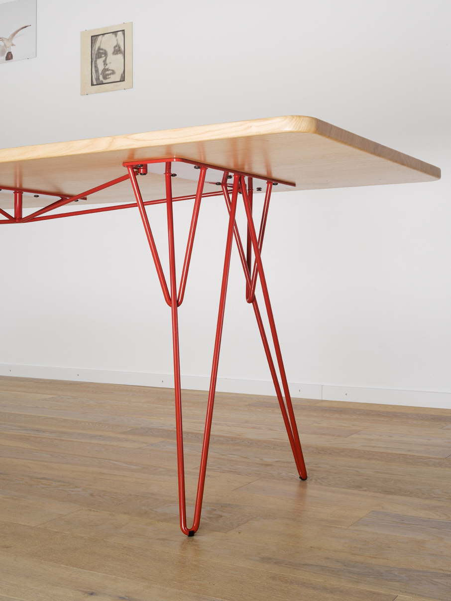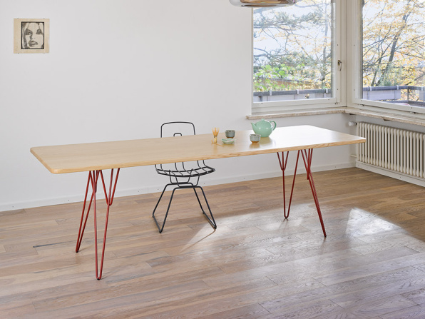 Der ittable ist in drei Grössen erhältlich, und kann je nach Grösse entweder als Arbeitstisch oder als Esstisch benutzt werden. Die Tischplatte ist aus Massivholz, das Tischgestell besteht aus einem filigranen Stahlfachwerk aus Rundstäben.