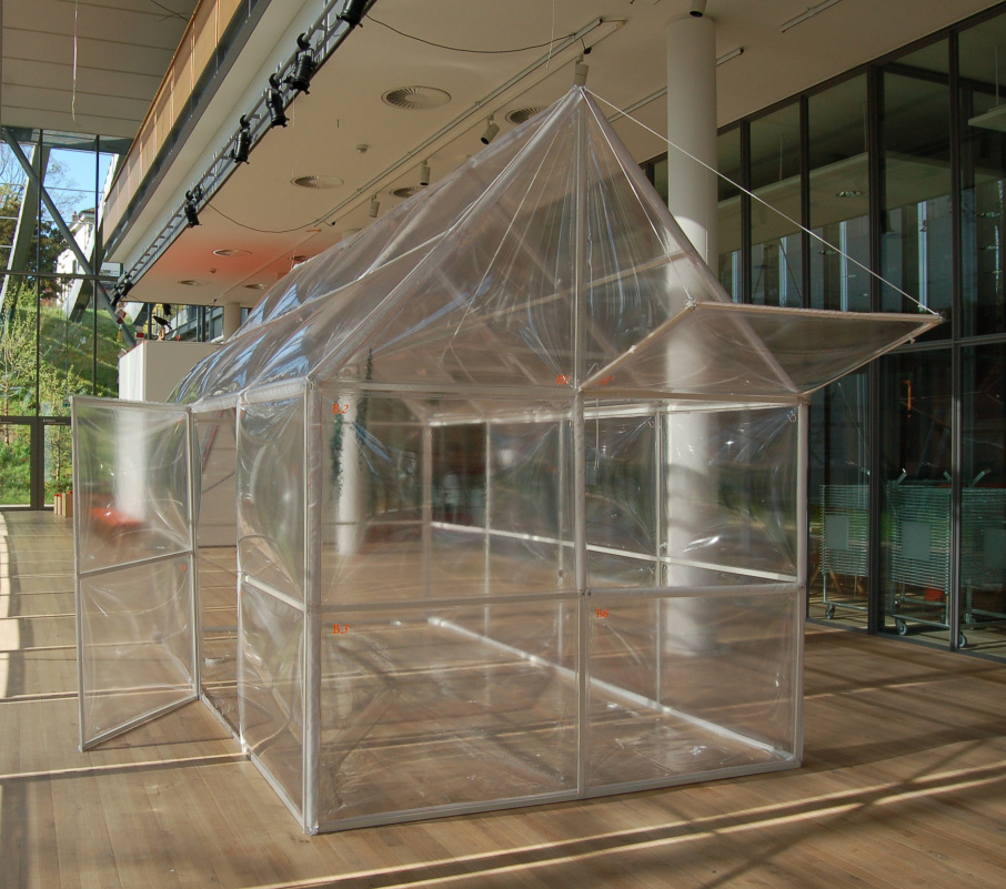 Die living unit two thematisiert die Urhütte im Zeitalter der Globalisierung. Die Kunststoffhülle und die Tragstruktur aus Glasfaserstäben der minimalen Wohneinheit wiegen je 20 kg und können daher als Gepäckstücke mit auf eine Flugreise genommen werden. Die mit Luft gefüllten Kissen der Hülle tragen zur Stabilität der Strukturbei und bilden zugleich Fassade und Fenster. Im Innern der living unit sind auf einer Grundfläche von 2.5 x 5.0 Meter ein Schlafzimmer, ein Bad mit Dusche und ein Wohnzimmer angeordnet. Folgende Fragen führten uns zu diesem Projekt: